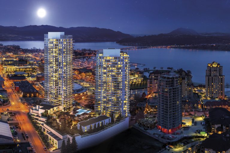 The product of meticulous planning and careful design by Kasian Architecture, ONE Water Street’s differing tower heights emulate the adjacent mountains surrounding the city. Glimmering in the Okanagan sun, the concrete and glass structure is the future home of 427 residents.